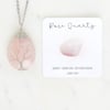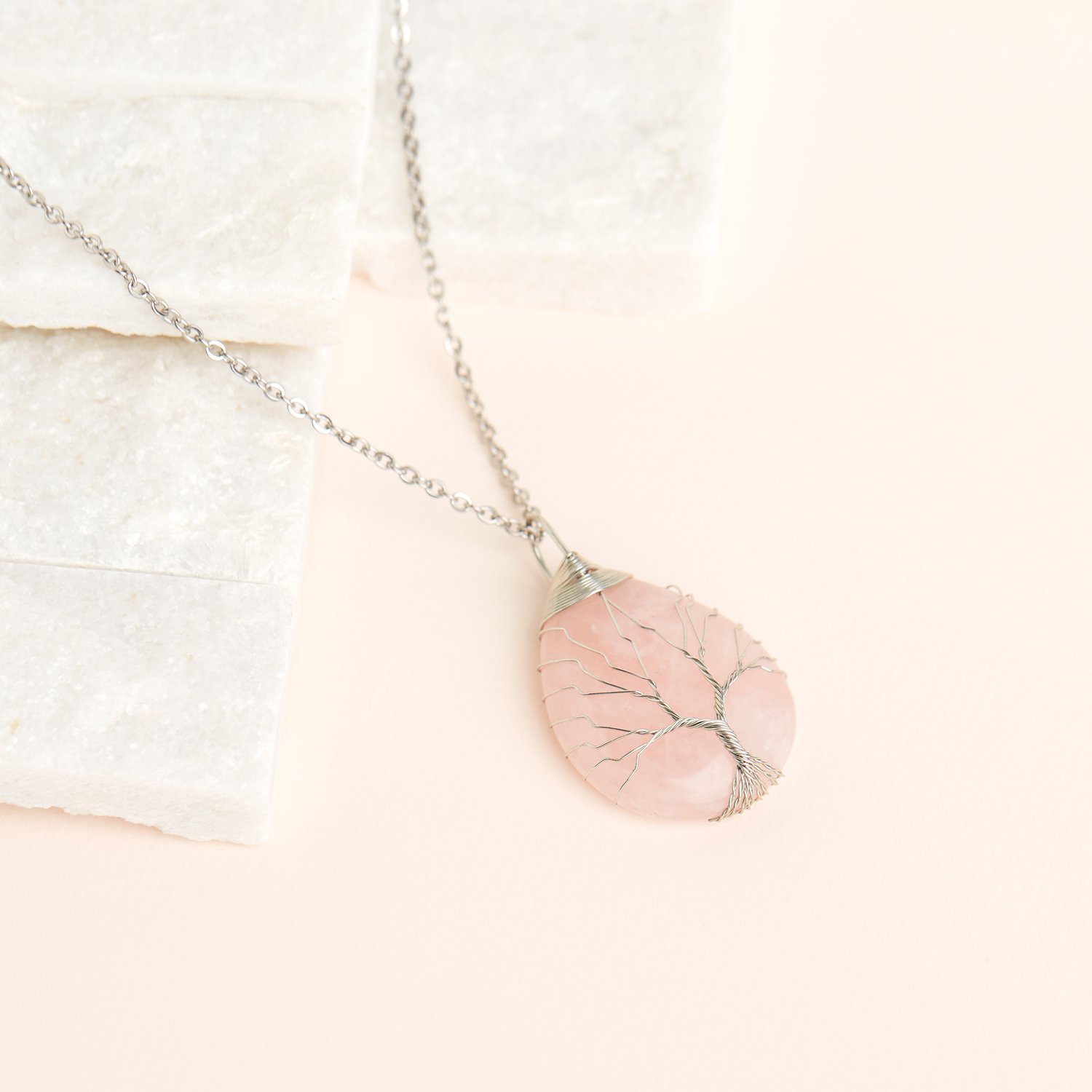 A handcrafted wire-wrapped Tree of Life pendant featuring your choice of Clear Quartz or Rose Quartz. The design pairs a timeless symbol with a natural stone, resulting in a piece that feels grounded, expressive, and easy to wear.