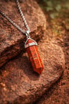 A hexagonal Red Jasper pendant featuring warm, earthy red tones and natural variation. The rich color paired with the clean geometry of the hexagon creates a piece that feels grounded, steady, and quietly confident.