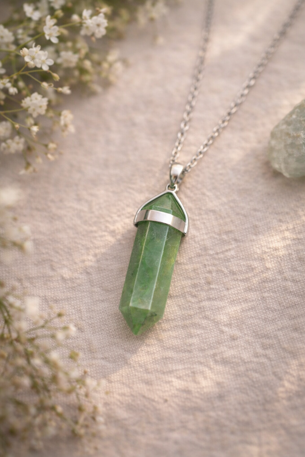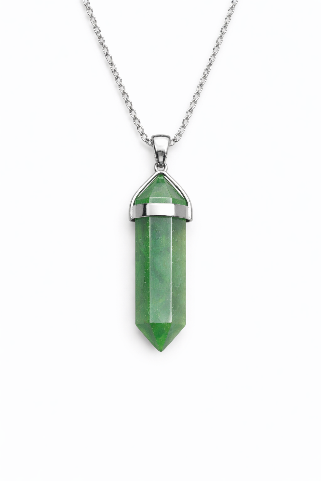A hexagonal Green Aventurine pendant featuring soft green tones and natural variation. The gentle color paired with the clean geometry of the hexagon creates a piece that feels fresh, balanced, and easy to wear.